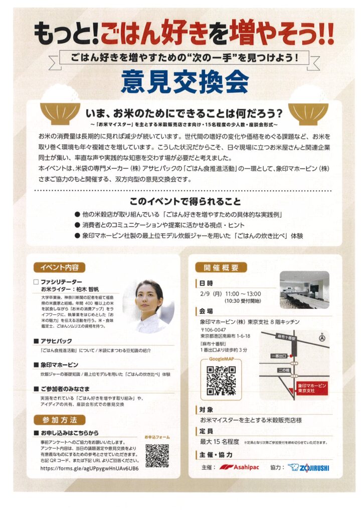 米袋専門メーカーの㈱アサヒパック(大阪府大阪市)では、2月9日に開くイベント「もっと! ごはん好きを増やそう!! 意見交換会」の参加者を募集している。対象は「お米マイスター」を中心とした米穀小売店。
