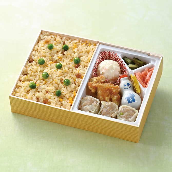 中身は、チャーハン(トッピング:グリンピース)、昔ながらのシウマイ3個、鶏の唐揚げ、ポテトサラダ、千切り生姜、きゅうり漬け、トリコロールひょうちゃん1種。