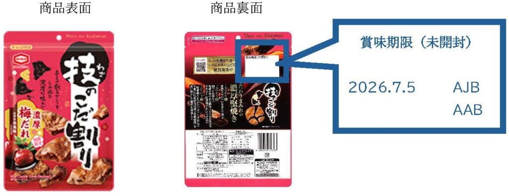 回収対象商品の送付・問合せ先は、亀田製菓㈱商品受付係(〒950-0198 新潟県新潟市江南区亀田工業団地3-1-1、TEL:0120-956-382)で、問合せは平日午前9時~午後5時に受け付けている。