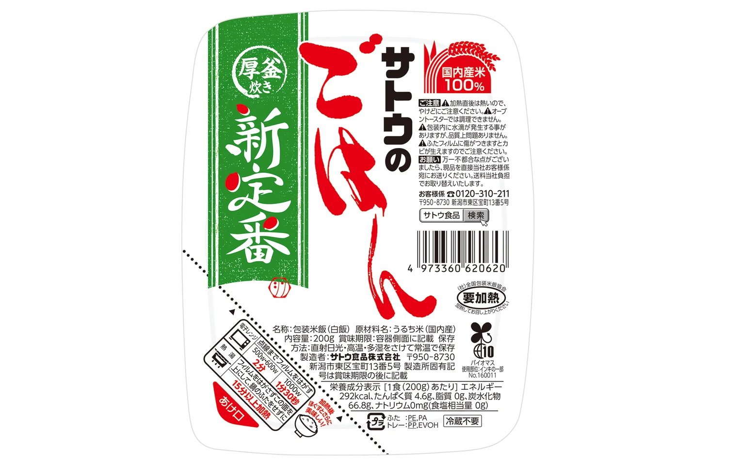 サトウ食品㈱(新潟県新潟市)は2月23日、パックごはん新商品「サトウのごはん 新定番」を発売した。200g。パックごはん「サトウのごはん」シリーズは、これまで産地品種銘柄名を前面に押し出す売り方をしてきたが、「サトウのごはん」のブランド名だけで勝負する。