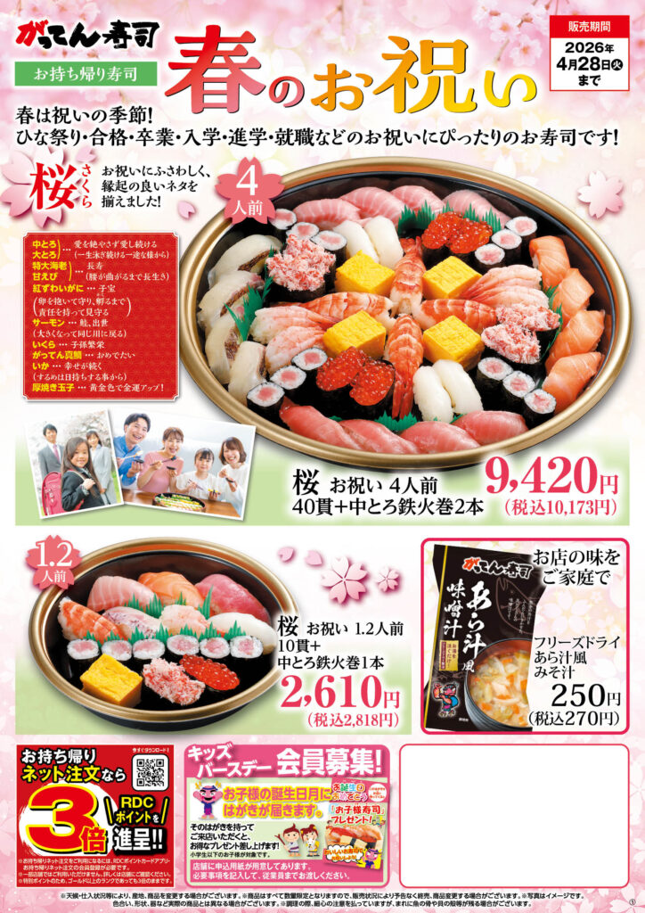 ㈱アールディーシー(埼玉県熊谷市)が運営する回転寿司チェーン「がってん寿司」は2月27日から、持ち帰り限定の新商品「桜(さくら)」を発売する。4月28日までの期間限定販売。