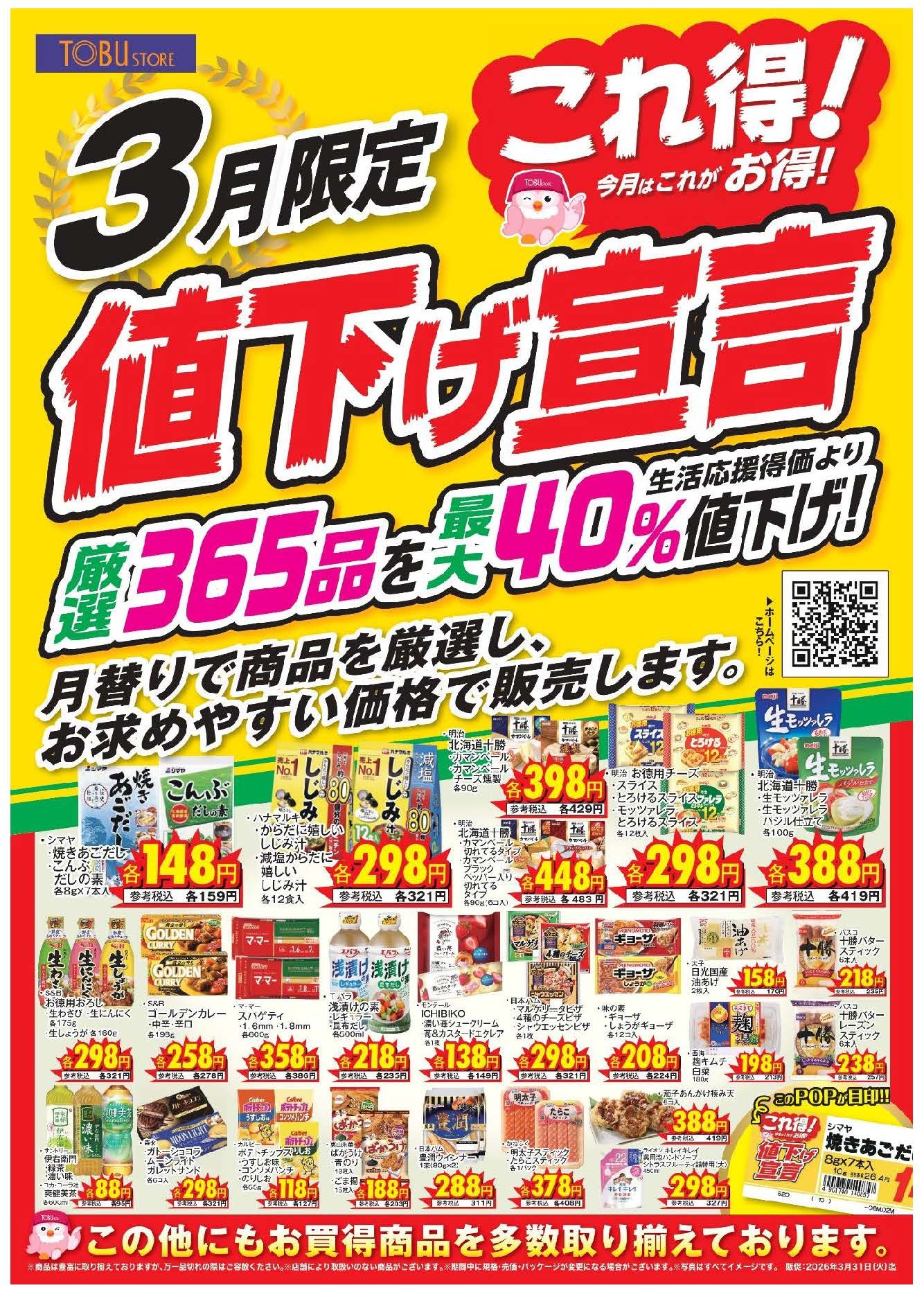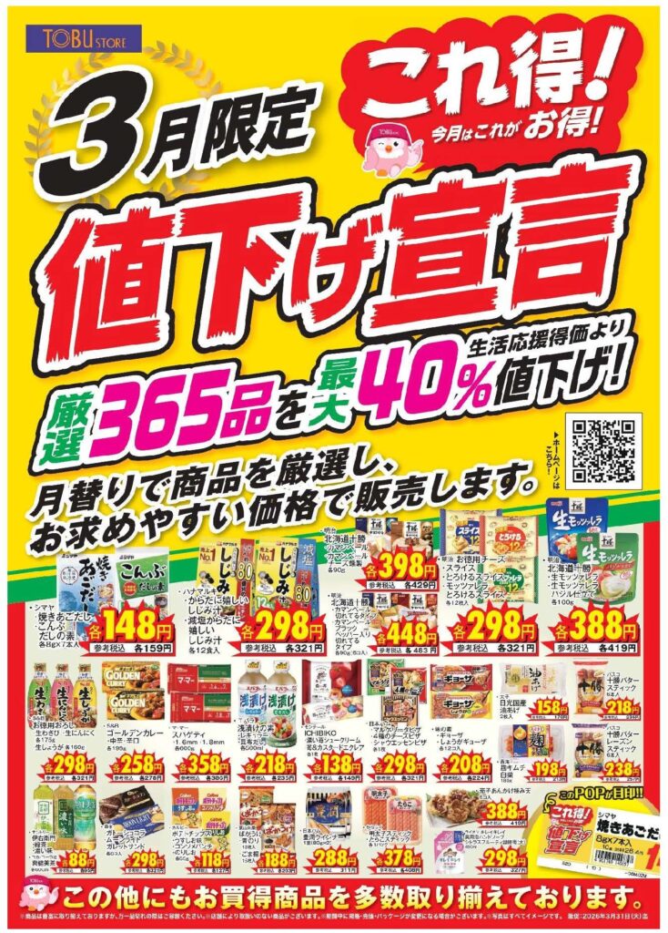 フェア 東武ストア 東武ストア、3月の1か月365品目を最大40%値下げ フェア X Facebook LINE コピー 2026.02.26 東武鉄道グループの㈱東武ストア(東京都板橋区)は2月25日、「これ得! 値下げ宣言」と題して、食品・生活用品365品目の値下げを発表した。3月1~31日の1か月間、「最大40%値下げする」とアピールしている。ただし、具体的な「値下げ商品の一例」に精米商品は見当たらない。唯一、米関連商品として例示されているのが栗山米菓「ばかうけ 青のり18枚入」と「ばかうけ ごま揚げ15枚入」で、税込270円前後を188円で販売する(値下げ率30.4%)としている。