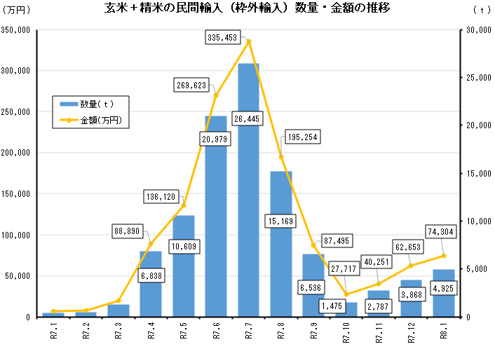 財務省が2月26日に公表した輸入通関実績によると、今年1月の外国産米(枠外)輸入量が3か月連続で増加していることが分かった。1月の外国産米輸入量は、4,925t(前月比+27.3%、前年同月比+1089.6%)、7億4,304万4千円(前月比+18.6%、前年同月比+988.8%)。