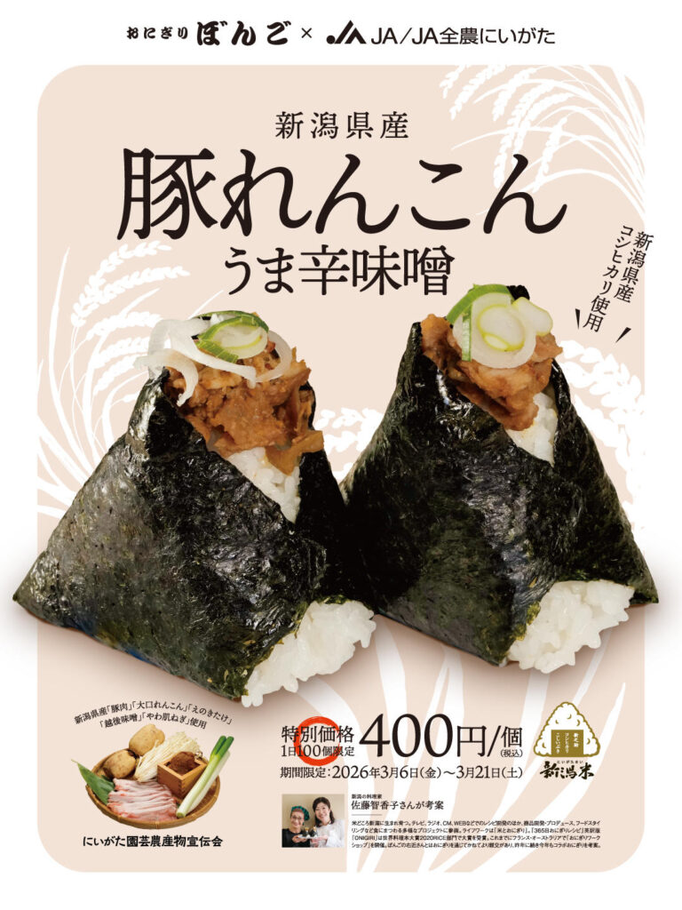 フェア ぼんご全農 ぼんご×全農県本部「豚れんこんうま辛味噌おにぎり」 フェア X Facebook LINE コピー 2026.03.05 東京・大塚の「おにぎりの専門店 ぼんご」は3月6日から、「豚れんこんうま辛味噌おにぎり」を発売する。全農新潟県本部とのコラボメニュー。3月21日まで。 おにぎりの米、具材は全て新潟産食材を使用。レシピは新潟の料理研究家・佐藤智香子氏が考案している。税込400円。100個限定。
