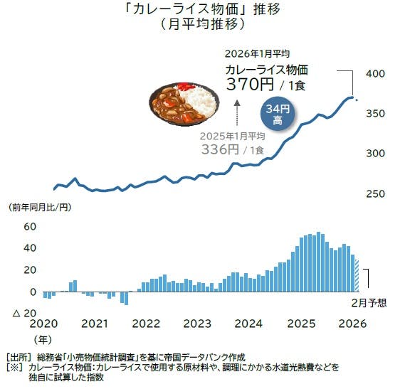 帝国データバンクが3月10日に公表した今年1月の「カレーライス物価」は1食370円となった。過去最高値の更新にあたるものの、前年比+34円(+10.1%)という値上がり幅は、過去1年で最小となった。