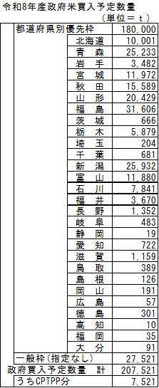 農林水産省は3月13日、令和8年産政府備蓄米の第1回買入入札を、公告した。4月14日に実施する。買入予定数量は20万7,521t。このうち第3回まで適用する都道府県別優先枠は例年通り18万tちょうどで、残る2万7,521tを一般枠(産地指定なし)に振り向けている。