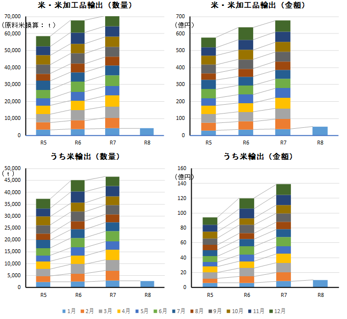 米菓、清酒、パック米飯、米粉製品などを加えた米・米加工品総体では、原料米換算の数量4,231t(+1.8%)、金額52億円(+36.8%)と、こちらは14年連続の過去最高更新に向けて、文句ないロケットスタートとなっている。