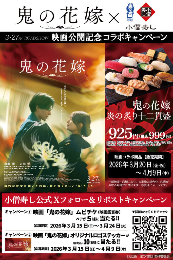 ㈱小僧寿し(東京都中央区)が運営する持ち帰り寿司店「小僧寿し」は3月20日から、映画「鬼の花嫁」とのコラボキャンペーンを開始する。