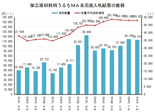 農林水産省の3月19日公表によると、加工用うるちMA米の令和7年度(2025)第3四半期(10~12月)のtあたり加重平均成約価格は、第1四半期15万3,520円(前四半期比+40円)。令和6年度(2024)第4四半期(昨年1~3月)の過去最高値15万5,935円とそう大差ない水準の高止まりを維持している。