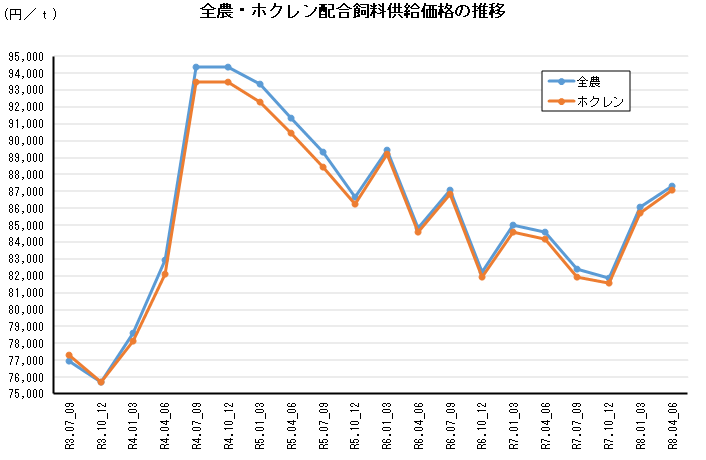 全農(全国農業協同組合連合会)とホクレン(ホクレン農業協同組合連合会、北海道札幌市)は3月19日、令和8年(2026)4~6月期 配合飼料供給価格の値上げを発表した。2四半期連続伸にあたる。値上げ幅は地域・畜種・銘柄によって異なるものの、前四半期(令和8年1~3月期)に比べ、総平均でtあたり全農+1,250円、ホクレン+1,400円。令和6年(2024)7~9月期以来ほぼ2年ぶりの高値に戻した恰好だ。