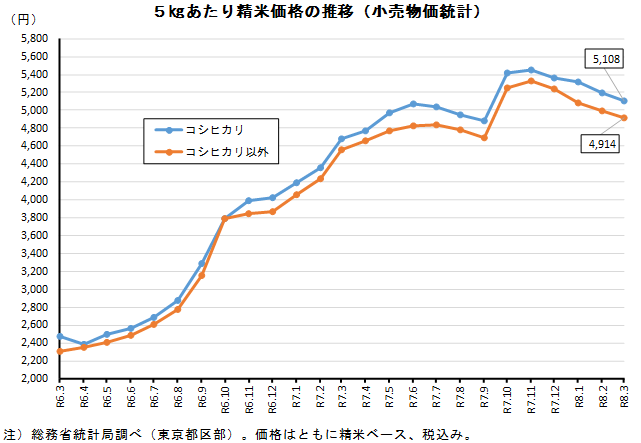 相場 小売物価統計総務省 2月の23区5kg店頭米価、3か月連続落でコシ5,108円 相場 X Facebook LINE コピー 2026.03.31 総務省は3月31日、3月の小売物価統計(東京都区部のみ)を発表した。それによると、「コシヒカリ」前月比▲89円の5,108円、「コシヒカリ以外」▲75円の4,914円と、ともに続落した。令和7年産米が主体になってからの続落は3か月連続。前年同月比増減率は、コシ+9.2%、非コシ+7.8%と、相変わらず高値なものの、前年同月に限りなく近くなってきている。