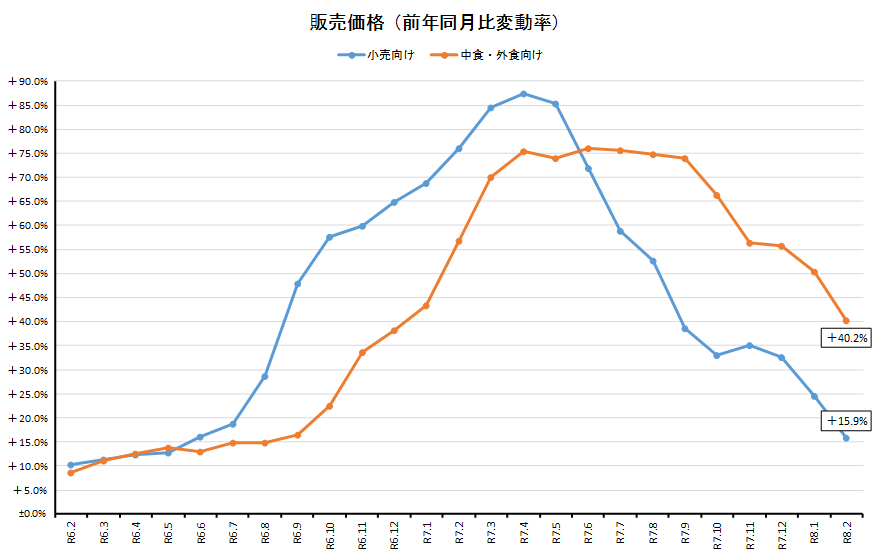 一方、販売価格は相変わらず前年比プラスが続いているものの、小売向け前年比プラス幅が3か月連続で、中食・外食向けの前年比プラス幅は9か月連続で縮小した。