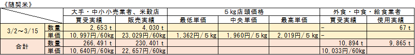 3月2~15日までの小売や実需などによる〝随契米〟の買受数量は27万7,385t(+2,653t)で、随意契約による放出量28万tの99.1%(+0.9ポイント)にあたる。このうち外食・中食・給食事業者の買受は前回公表(2月23日~3月1日分)までで売渡を完了していることから、今回の残2,600t強は、全量が大手・中小小売業者と米穀店向け。ここまでのペースからすると、次回公表で随契米が先に全量売渡を完了する公算が高い。