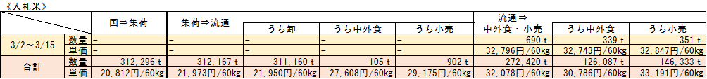 3月2~15日までの小売到達数量のうち〝入札米〟は27万3,322t(+690t)で、入札による放出量31万tの88.2%(+0.2ポイント)にあたる。