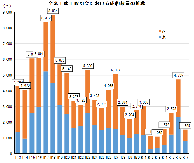 全米工(全国米穀工業協同組合、東京都千代田区)取引会における令和7年度(2025)成約数量が、ワースト3にあたる1,525tにとどまった。前年度実績(4,735t)の3分の1にも満たない激減ぶりとなった背景には、「末端で米が売れない」ことに加え、「先に高値で仕入れた在庫が捌けないと安値玉であっても仕入れられない」苦しさがある。