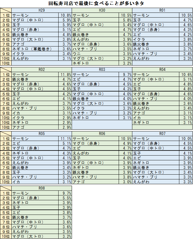 回転寿司店で最後の〆に食べることが多いネタ。これも平成29年(2017)からの10年間で1位「サーモン」が不動だが、2位以下は「人気ネタ」や「最初ネタ」と傾向が異なる。とはいえ上位の常連は、「マグロ(中トロ)」、「玉子」、「マグロ(赤身)」、「鉄火巻き」、「エビ」といったところ。不動の「サーモン」からすると、好きなものは最初にも食べるが最後にも食べるということか。