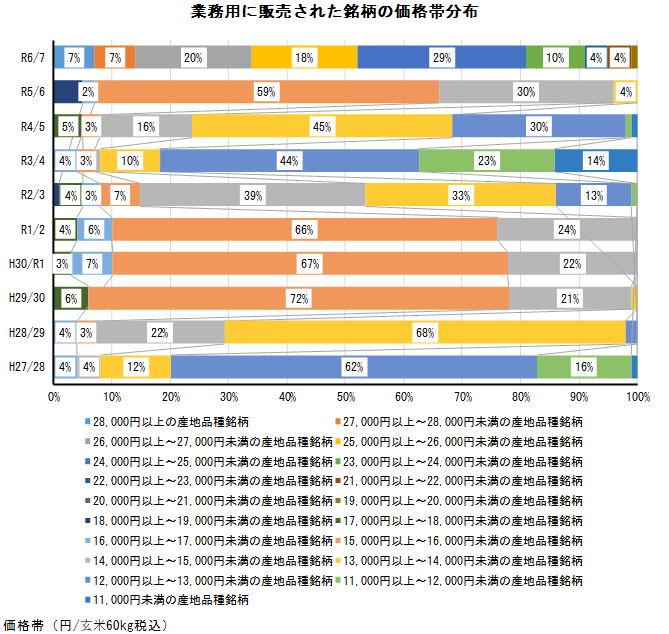 いわゆる「令和の米騒動」まっただ中だったため、前年までと全く異なる価格帯が出現した。ボリュームゾーンは令和5/6年の15,000~16,000円から、令和6/7年は24,000~25,000円と、一挙に10,000円以上も上昇した。
