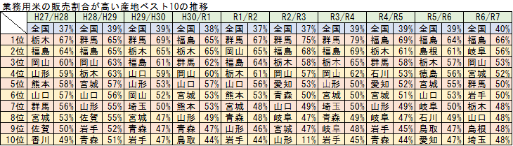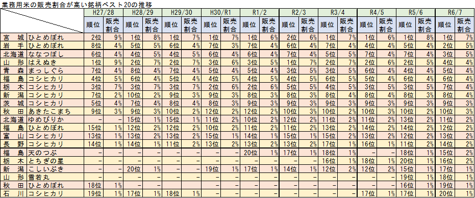 宮城ひとめぼれがV4(8度目)を飾った一方、統計開始以来2位・3位の常連だった山形はえぬき、栃木コシヒカリが4位と7位に転落。代わって2位に岩手ひとめぼれ、3位に北海道ななつぼしがつけるという激動ぶりとなった。