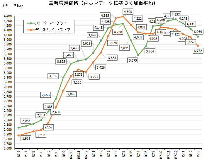 農林水産省は4月17日、うるち精米の量販店頭価格(POSデータ)を、3月の全POS取引平均価格(全体の加重平均)で5㎏3,969円だったと公表した。前月比▲162円、前年同月比▲176円にあたり、ついに月間POSでも3か月連続落して5㎏4,000円を割り込んだ。マンスリーレポート4月号のなかで明らかにしたもの。取引数量は4,232t(前月比+549t)と続伸している。価格が下がってきたのだから購入量が増えるのは当然と言える。一方、ドラッグストアの全POS取引平均価格は5㎏3,772円(前月比▲185円)で、5か月連続落にあたる。ドラッグストア米価は一足先、2月の時点で4,000円台を割り込んでいた。