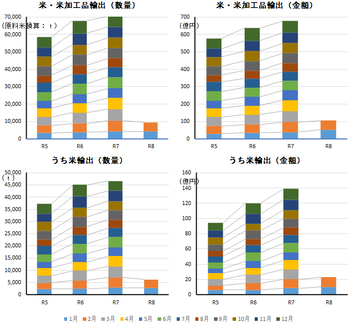 米菓、清酒、パック米飯、米粉製品などを加えた米・米加工品総体では、原料米換算の数量5,308t(▲14.3%)、金額53億円(▲10.2%)と、こちらも2月単月では前年比マイナスだったものの、累計では前年同月を上回った。14年連続の過去最高更新に向けて、まだまだ元気な輸出が続いている。