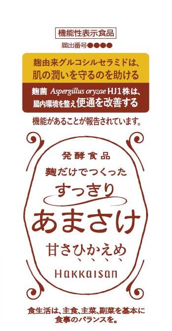 届出日は今年1月26日で、機能性関与成分は「麹菌Aspergillus oryzae HJ1株」と「麹由来グルコシルセラミド」。表示しようとする機能性は、「本品には麹菌Aspergillus oryzae HJ1株と麹由来グルコシルセラミドが含まれます。麹菌Aspergillus oryzae HJ1株は、腸内環境を整え、便通を改善する機能があることが報告されています。麹由来グルコシルセラミドは、肌の潤いを守るのを助ける機能があることが報告されています」。製造は自社あまさけ製造所(新潟県南魚沼市)。