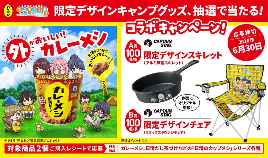 第1弾「外がおいしい! カレーメシ」キャンペーンでは、アウトドア用品ブランド「CAPTAIN STAG」とタッグを組み、「カレーメシ×ゆるキャン△」限定デザインのキャンプグッズを用意。対象商品を2食以上購入した人のなかから抽選で計200人に、「限定デザインスキレット」や「限定デザインチェア」が当たる。また一部店舗やECサイトでは、「限定デザインスプーン」のプレゼントも。