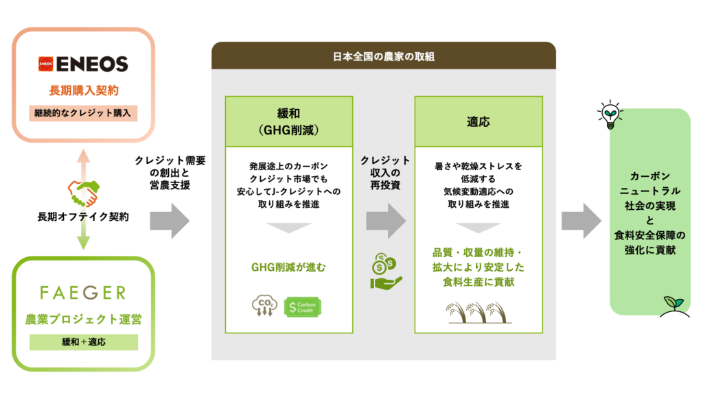 ENEOSでは令和12年度(2030)目標として、CO2排出量を平成25年度(2013)比46%削減をめざしており、フェイガーの「中干し期間の延長」によるJ-クレジット創出の取組みとが合致した。フェイガー側は将来的に、我が国水田の約20%に相当する年100万t規模のJ-クレジット創出をめざしており、ENEOSが「その実現を後押しすることで、食料安全保障に資する社会的インパクトの創出をはかる」としている。