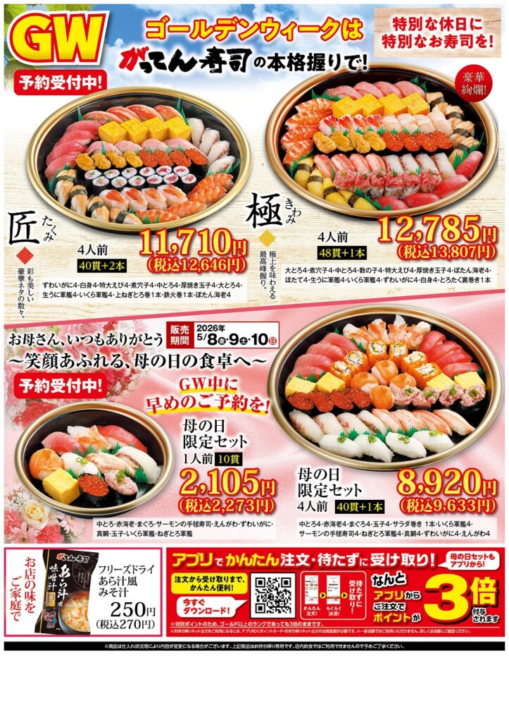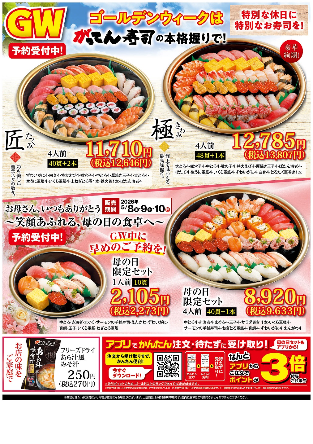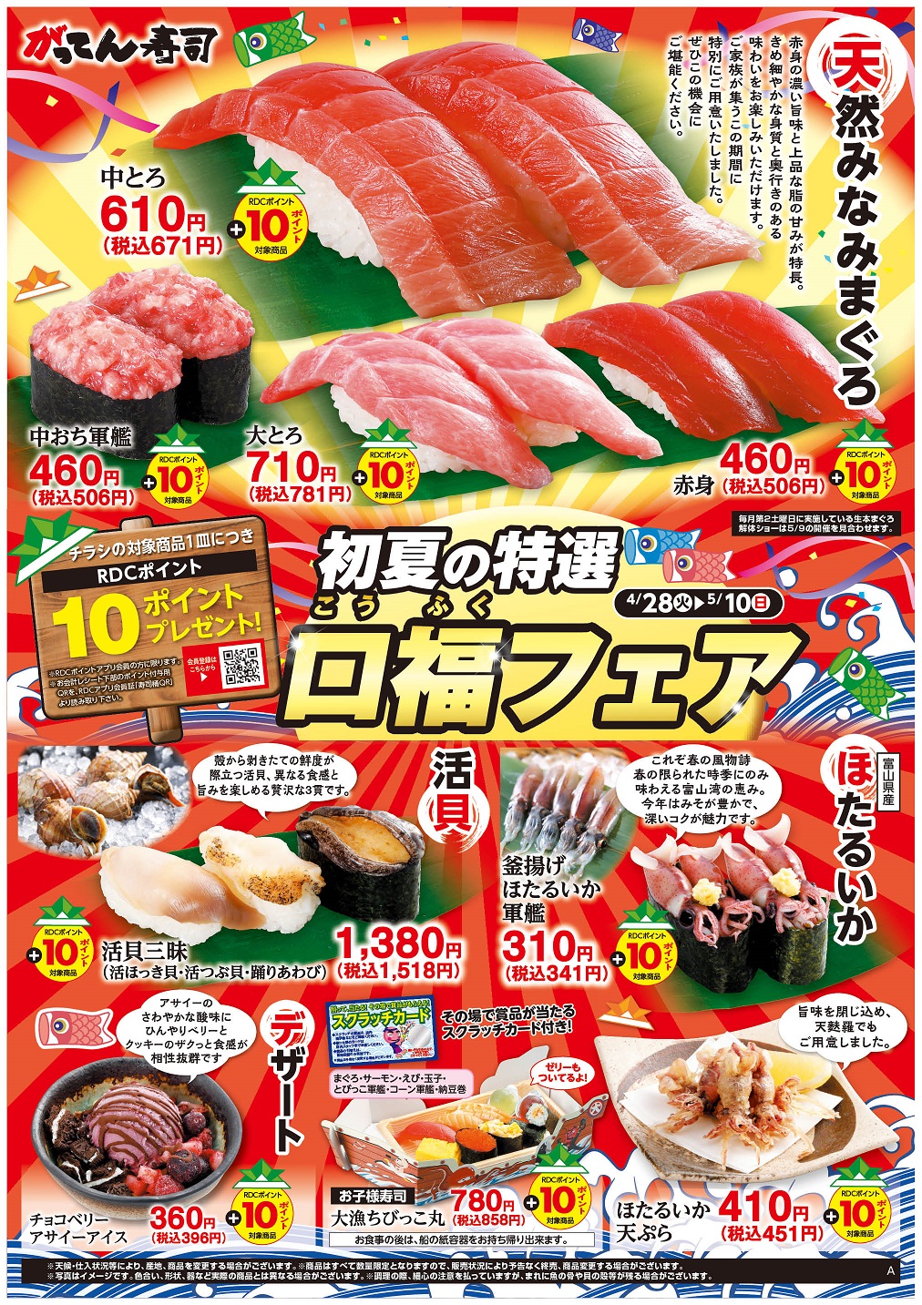 ㈱アールディーシー(埼玉県熊谷市)が運営する回転寿司チェーン「がってん寿司」は4月28日から、「初夏の特選『口福(こうふく)』フェア」を開始する。5月11日までの期間中、「天然みなみまぐろ」の中とろ(税別610円)、赤身(460円)、大とろ(710円)、中おち軍艦(460円)を提供。富山産ほたるいか軍艦(310円)、活貝三昧(握り3貫1,380円)も揃えた。持ち帰りでは、5月10日の「母の日」に合わせ5月8~10日に「母の日限定セット」(1人前10貫2,105円、4人前40貫8,920円)を展開するため、予約を受付中だ。