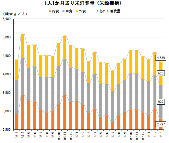今年3月の1人1か月あたり米消費量は4,339精米gで、前月比▲5.8%と、再び反落した。前年同月比では▲0.2%の13か月連続落。米穀機構(《公社》米穀安定供給確保支援機構、東京都中央区)が4月27日に公表した「米の消費動向調査結果」によるもの。これで令和7年度(2025)が出揃い、4,435g(前年比▲6.1%)と、4年ぶり減少が確定した。人口が〝順調に〟減少していることを考えると、いくらインバウンドが増えているとはいえカバーしきれるものではなく、「そりゃあ米が売れないわけだ」との業界内の得心が聞こえてきそうだ。それもこれも原因は米価高騰にあり、〝犯人捜し〟が始まるのも時間の問題と言える。